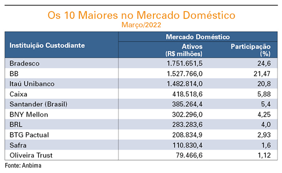 No período considerado pelo ranking da Anbima, até março deste ano, entretanto, sua participação relativa no mercado total de custódia recuou do percentual anterior de 5,5% para 5,2%. Em março, a instituição ocupava o quinto lugar no ranking da Anbima e seu total de ativos sob custódia era de R$ 487 bilhões, dos quais R$ 385 bilhões em recursos do mercado doméstico, no qual deteve participação de 5,4%. Os seus ativos para o mercado externo, somando os de não-residentes e os DRs (depositary receipts), atingiam R$ 102 bilhões e 4,6% de participação.